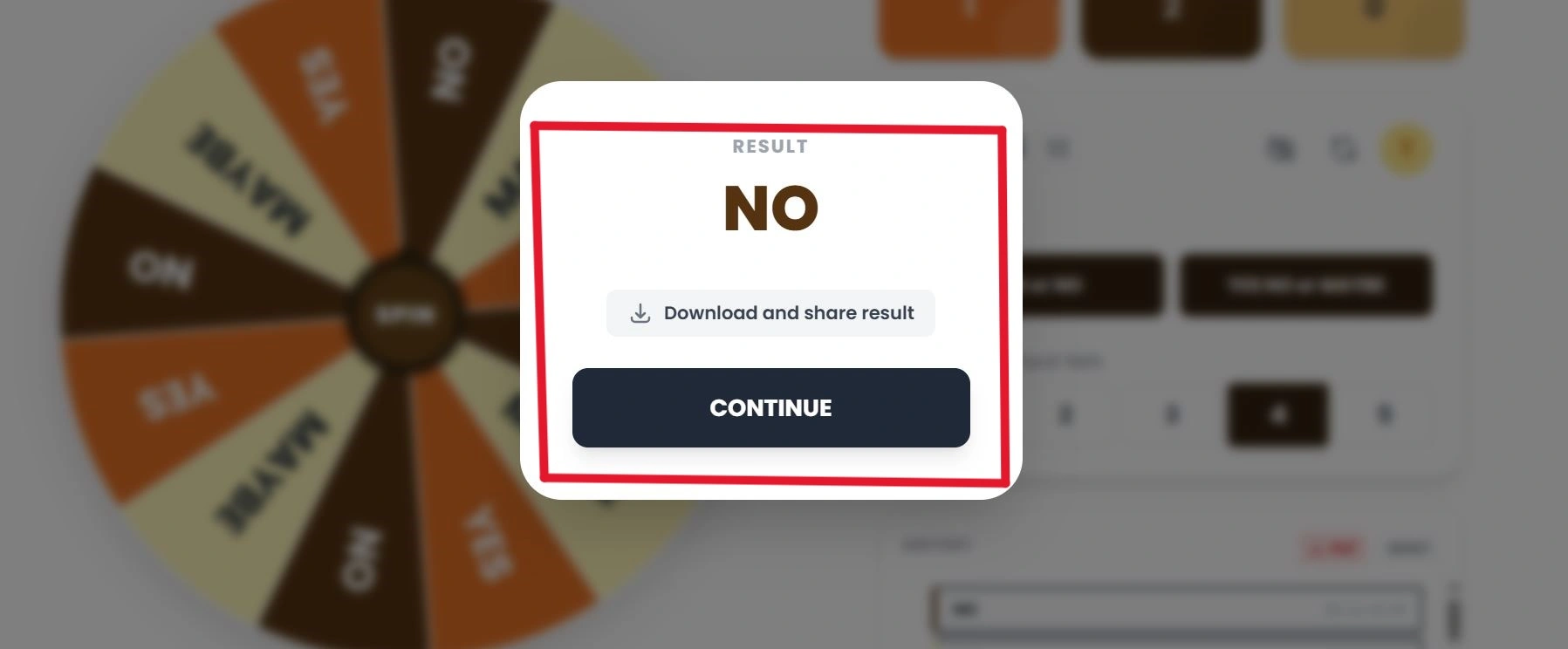 - Result and Sharing: Now you are good to press the Spin Button to see your random, result. The result will popup and you will also have an option to download and share this result in an image form.